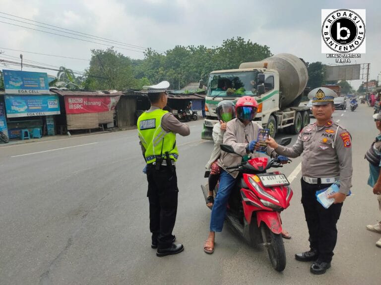 Serkab – Bantenmore.com ¦ Dalam rangka kelancaran musim mudik lebaran Idul Fitri 1445 Hijiriah, personil Satlantas Polres Serang membagikan leaflet atau brosur kepada pengguna jalan di Kawasan Industri Modern Cikande, Kabupaten Serang, Minggu (31/3/2024).