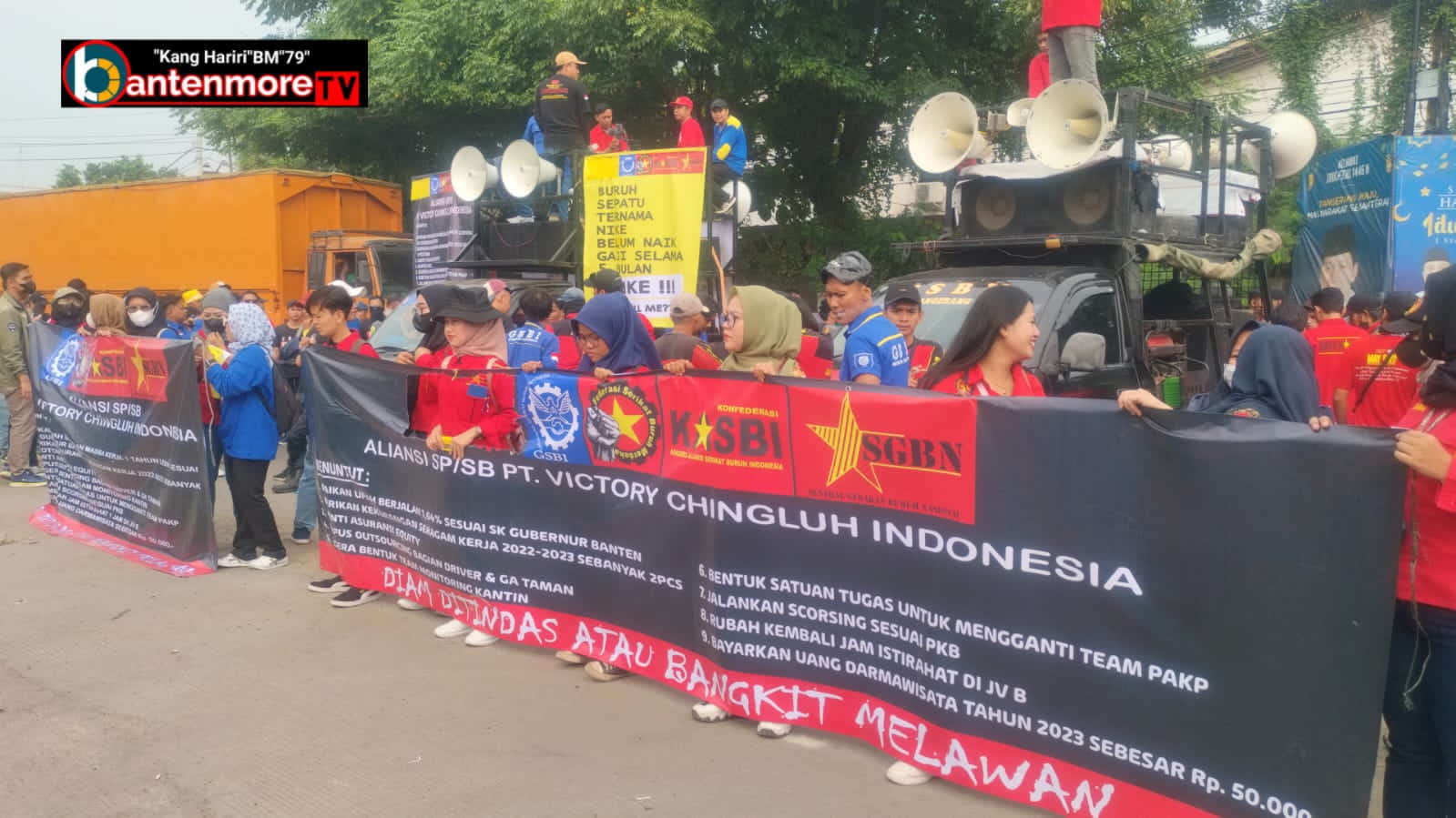 Ps Kemis – Bantenmore.com | PT.Victory Chingluh Indonesia yang berlokasi di Jl. Raya Pasar Kemis Kabupaten Tangerang Provinsi Banten di Gruduk Aksi Demo dari berbagai Organisasi Serikat Buruh Se-Kabupaten Tangerang. Senin (20/05/2024)