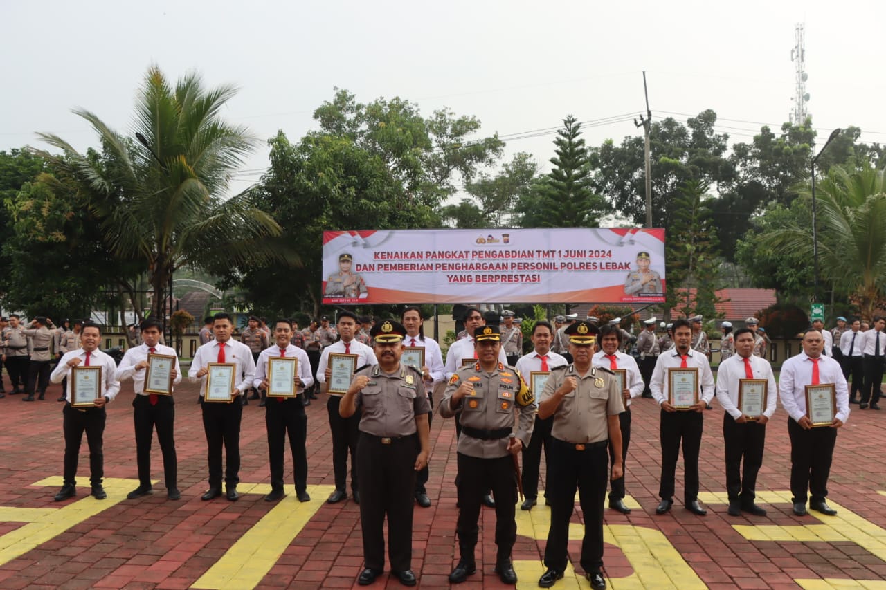 Lebak – Bantenmore.com ¦ Kapolres Lebak Polda Banten AKBP Suyono, SIK memimpin Upacara Laporan Kenaikan Pangkat Pengabdian TMT 1 Juni 2024 dan Pemberian Penghargaan kepada Personil Polres Lebak yang Berprestasi di lapangan Mapolres Lebak. Senin (3/6/2024).