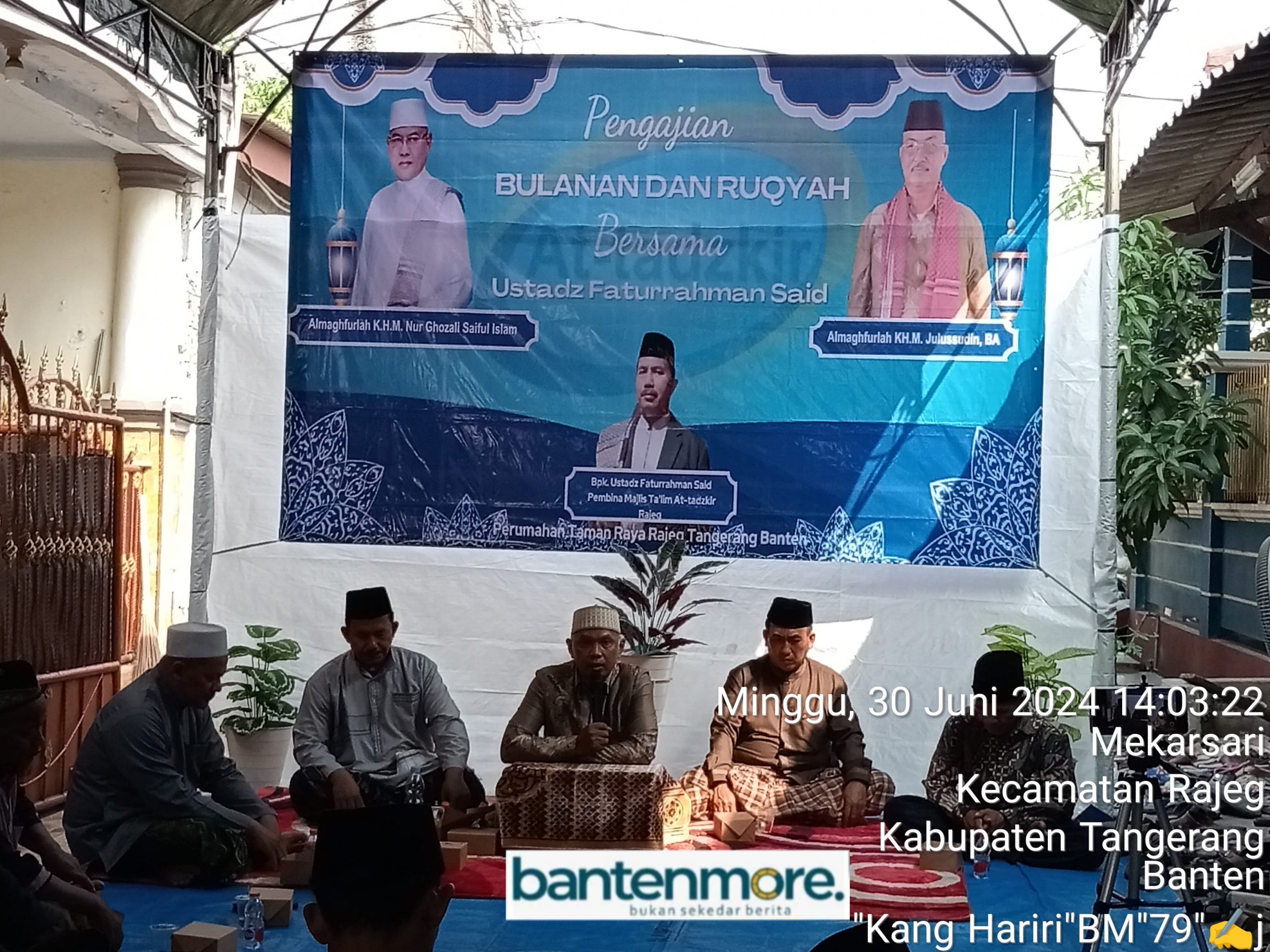 Rajeg – Bantenmore.com ¦ Dalam Rutinitas bulanan Pengajian di Majlis Dzikir At-Tadzkir yang beralamat di Perumahan Taman Raya Desa Mekarsari Kecamatan Rajeg Kabupaten Tangerang, kediaman Ustadz Faturahman Said. Acara dimulai pukul 1?:00wib hingga selesai hari Minggu, 30/06.