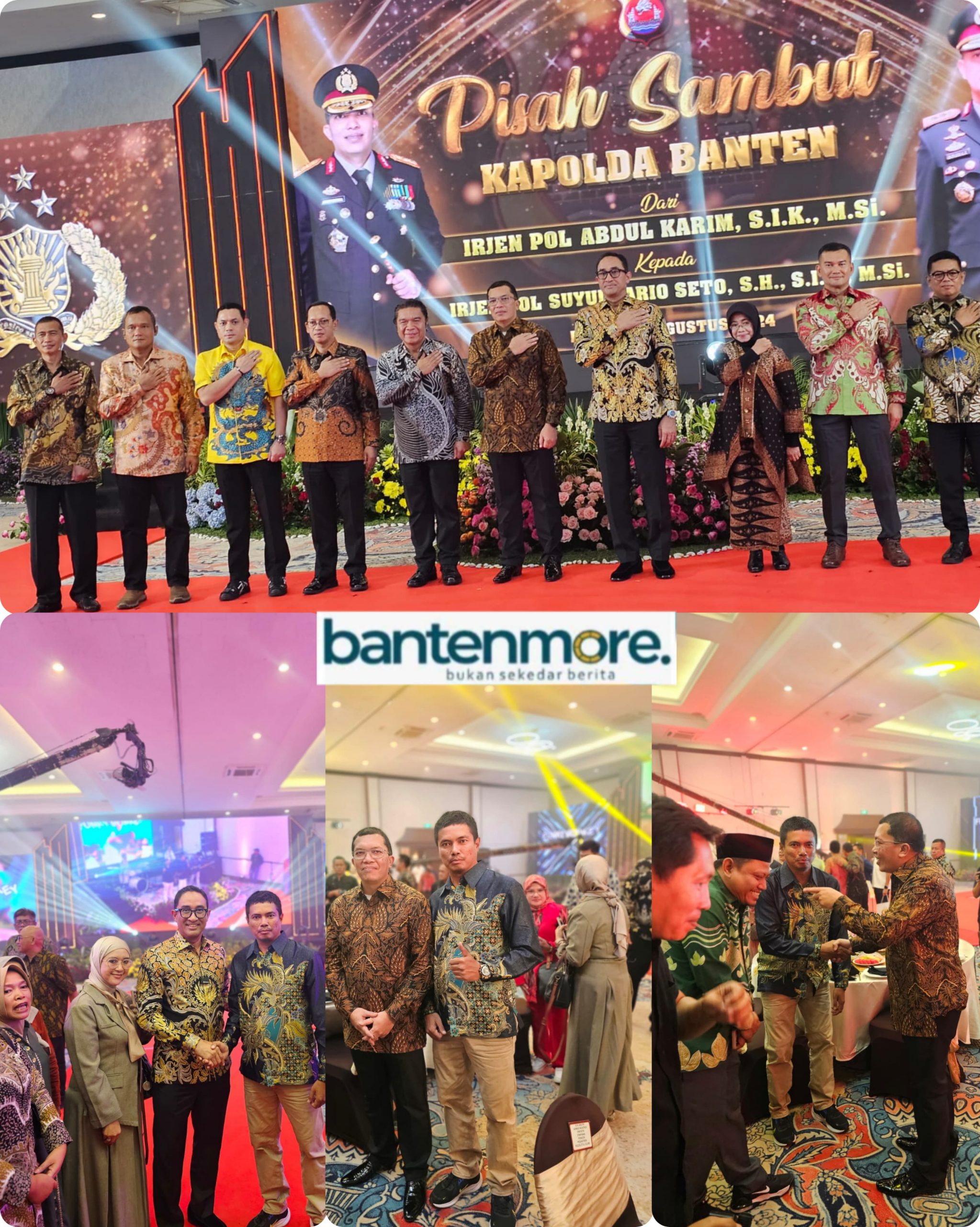 Cilegon – Bantenmore.Com ¦ Dalam Rangka Undangan Pisah Sambut Kapolda Banten H. Herdia/Abie dan H. Dadi Sugiana perwakilan dari PT. BMP Bandung penuhi undangan menghadiri pisah sambut dari Irjen Pol. Abdul Karim, S.I.K.,M.SI. kepada Irjen Pol. Suyudi Ario Seto, S.H., S.I.K., M.SI. Bertempat di Ballroom Hotel Royal Krakatau, Jl. KH.Yasin Beji No.4, Kebondalem, Purwakarta, Cilegon Banten. Acara dimulai pukul 19.00 s/d selesai. (Rabu, 07/08/2024)