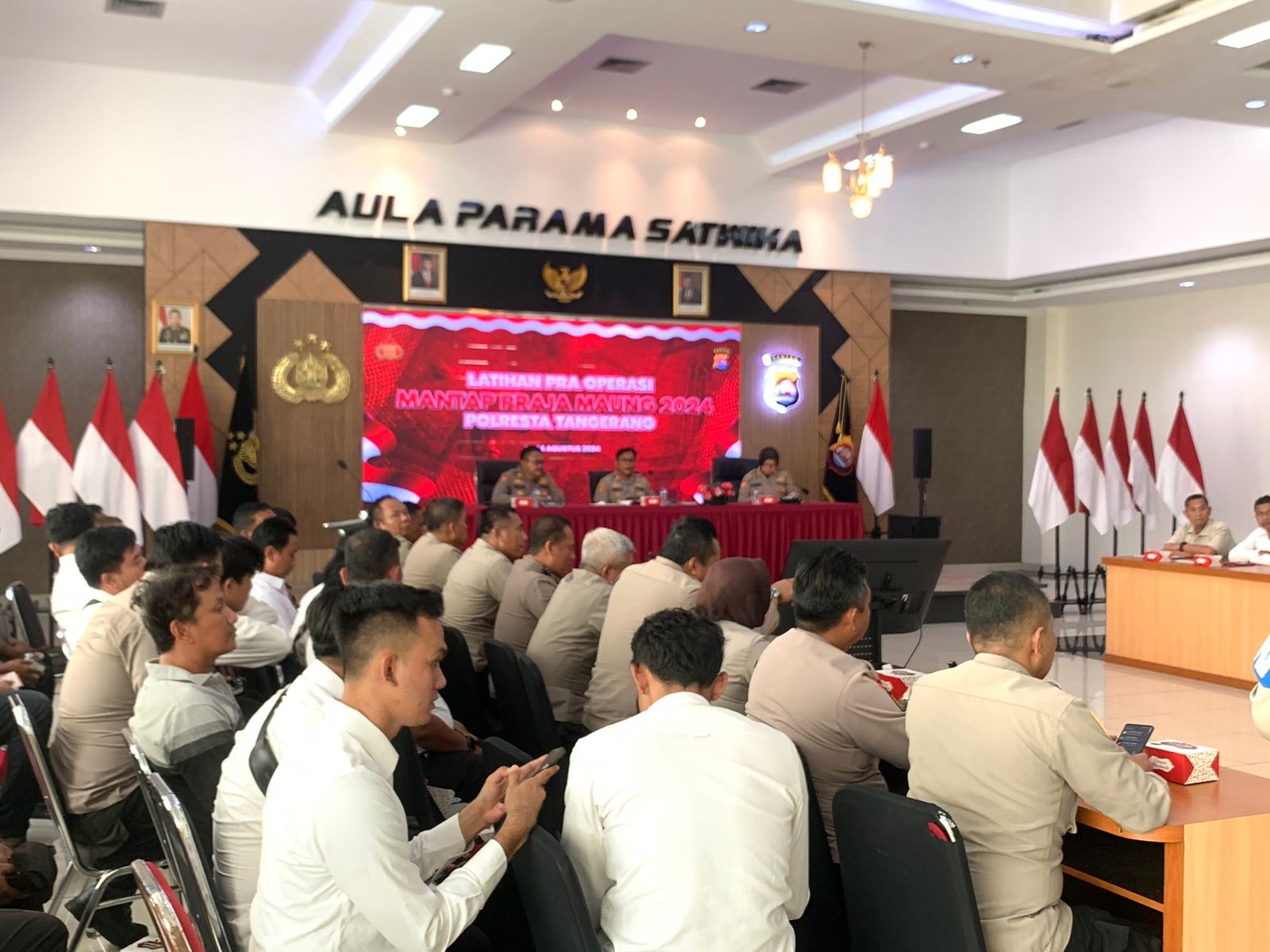 Tangerang – Bantenmore.com ¦ Anggota Satuan Reserse Kriminal (Sat Reskrim) Polresta Tangerang yang terlibat dalam Operasi Mantap Praja (OMP) mengikuti Latihan Pra Operasi (Latpraops) di Aula Parama Satwika, Polresta Tangerang. Latpraops ini diadakan sebagai persiapan pelaksanaan pengamanan Pilkada Gubernur Banten dan Bupati Tangerang yang akan datang. Senin (19/8/24)