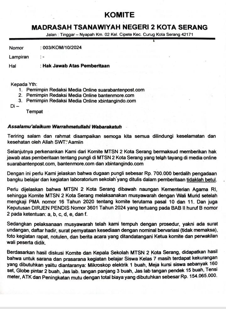 Kota Serang – Bantenmore.com ¦ Terkait adanya pemberitaan di beberapa Media Online dengan judul “forum aktivis Serang Selatan mengadukan dugaan pungli di MTS Negeri 2 Kota Serang ke Kemenag Kota Serang dan Ombudsman RI Banten” ini kata Komite MTS Negeri 2 Kota Serang dalam hak Jawab nya yang di kirim melalui pesan WhatsApp dengan nomor surat 003/KOM/10/2024.