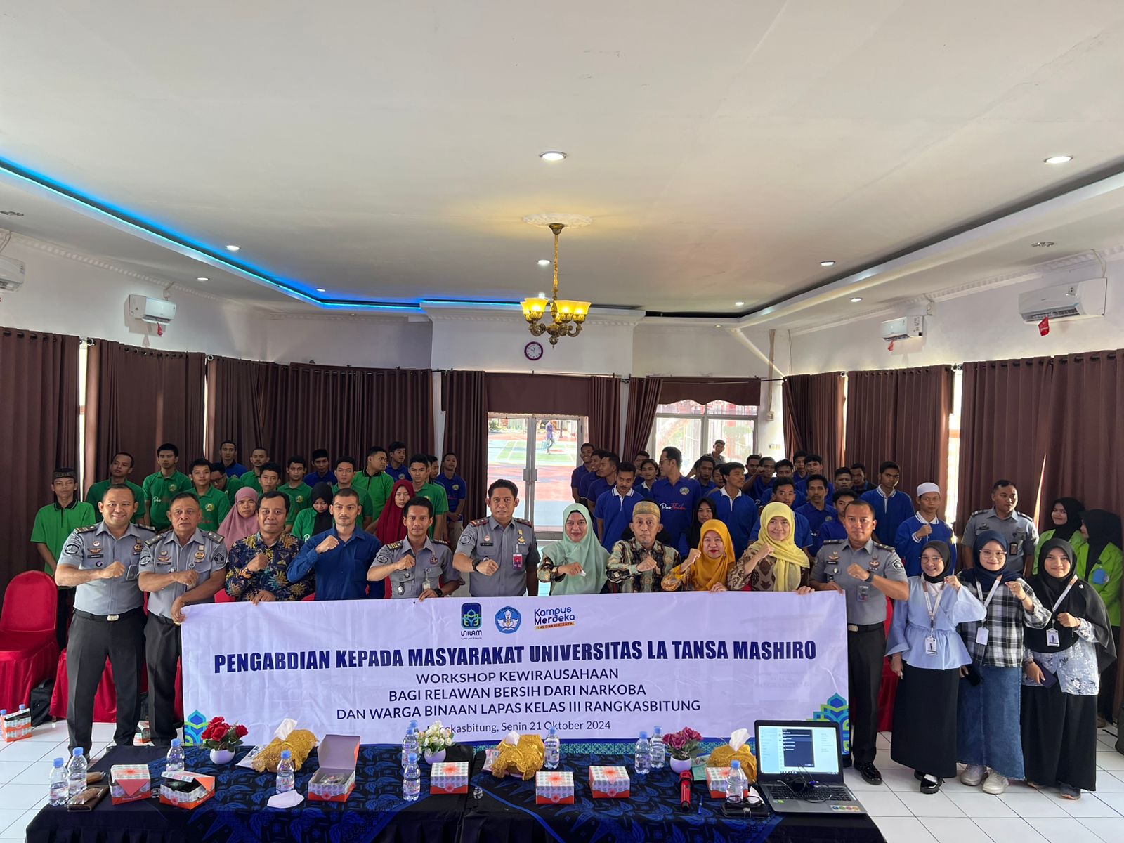 Rangkasbitung – Bantenmore.com ¦ Lapas kelas III Rangkasbitung Kanwil Kemenkumham Banten bekerjasama dengan Universitas Latansa Mashiro menggelar kegiatan pengabdian masyarakat dalam bentuk workshop yakni program pengembangan kewirausahaan bagi relawan bersih dari narkoba dan Warga Binaan Pemasyarakatan Lapas Rangkasbitung, Senin (21/10)