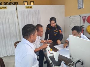 Kasidokkes Polres Tolitoli Penata Syamsuriyani A. Md, Kep bersama Dokter Umum Klinik dr. Ardiansyah bersama Staff Dokkes Polres Tolitoli melakukan sceaning kesehatan pemeriksaan yang meliputi : pemeriksaan fisik yakni; pemeriksaan berat badan dan tinggi badan, melakukan Pemeriksaan tanda- tanda vital yakni; pemeriksaan tekanan darah, nadi, spo- spo dan respirasi. Dan , anamnesa keluhan dan pengobatan sehari-hari.