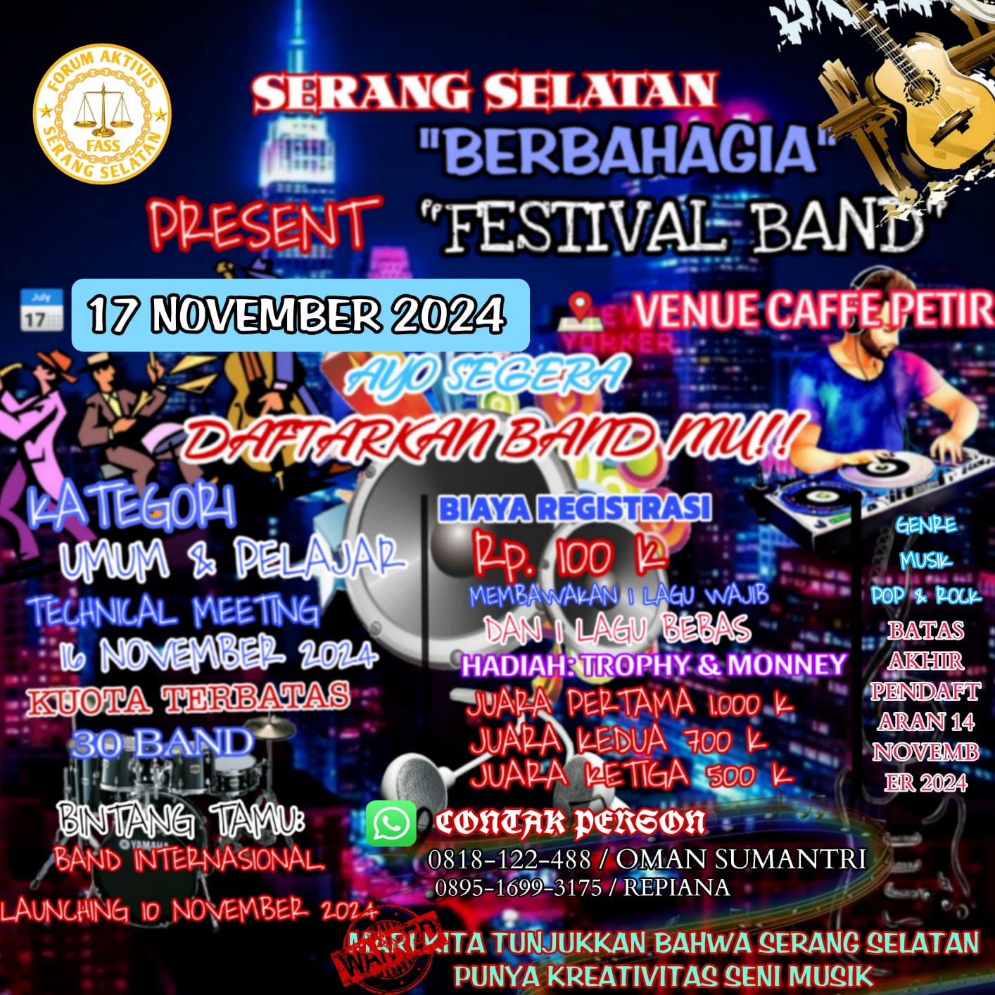 Bagi kalian yang punya band musik berdomisili di Kabupaten Serang mari daftarkan band terbaik anda karena kuota terbatas. [*/repi]