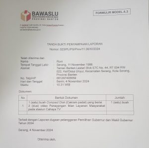 Dengan menyerahkan beberapa bukti, Laporan tersebut diterima langsung oleh Zaenal Mutakin Anggota Bawaslu Banten Bidang Divisi sengketa Perkara, di Gedung Bawaslu , Kawasan Ciceri Kota Serang, pada Senin (04/11/2024)