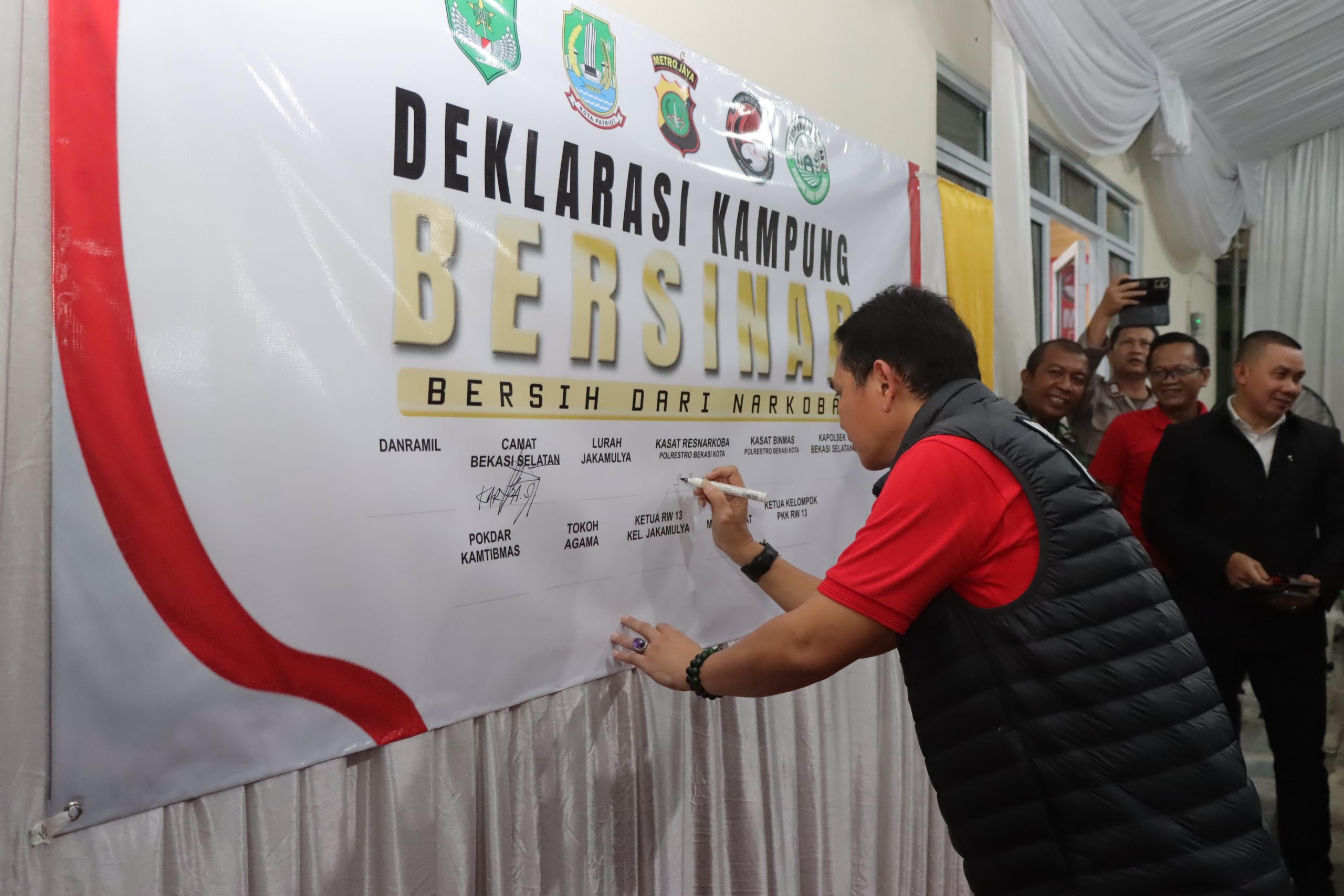 Kota Bekasi – Bantenmore.com ¦ Dalam rangka Mendukung Program Astacita yang di Canangkan oleh Presiden Republik indonesia RW 13 di Kelurahan Jakamulya, Kecamatan Bekasi Selatan, resmi dideklarasikan sebagai “Kampung Bersinar” dalam upaya menciptakan lingkungan bebas narkoba.pada Kamis Malam [21/11/24] Acara yang diadakan oleh Sat Resnarkoba Polres Metro Bekasi Kota ini dihadiri oleh berbagai pihak, termasuk wakil Kapolres, camat, tokoh masyarakat, dan pengurus RW setempat.