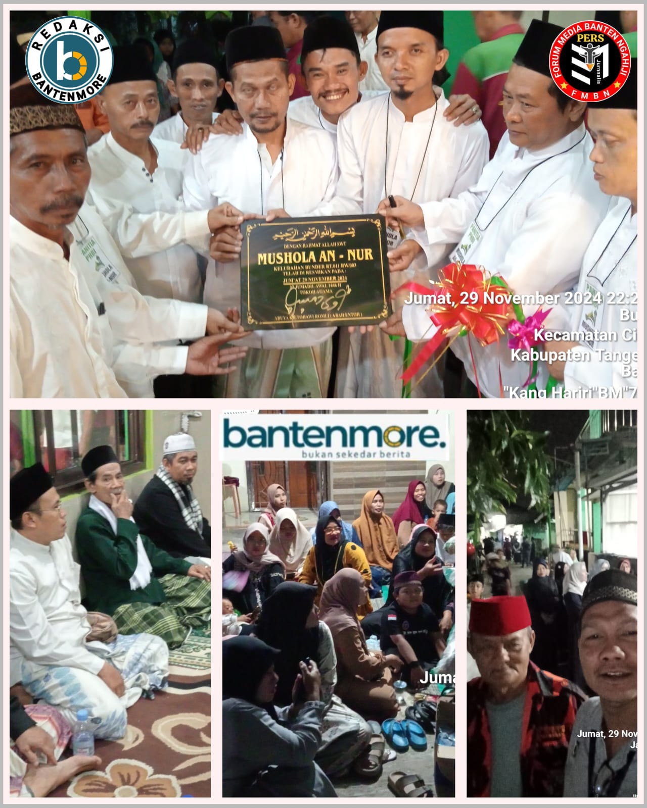 Cikupa – Bantenmore.com ¦ Dengan rampungnya pembangunan Mushola AN-NUR yang berlokasi di lingkungan RT 011/03 Kelurahan Bunder Kecamatan Cikupa Kabupaten Tangerang sudah bisa digunakan untuk beribadah dengan nyaman. Peresmian diawali dengan gunting pita dan dilanjutkan penandatangan serta Tasyakuran yang dipimpin oleh Buya KH. Tohawi Romli dari Pesantren Al-Istiqlaliyyah Cilongok Desa Sukamantri Kecamatan Pasar Kemis Kabupaten Tangerang. Acara dilaksanakan pada hari Jum’at 29-11-2024 malam, pukul 20:00wib hingga selesai.