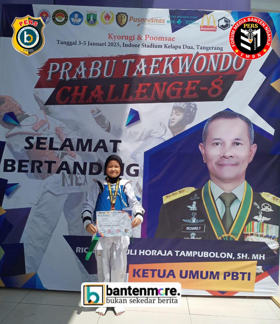 Tangerang – Bantenmore com ¦ Atlet Taekwondo Putri dari Club Garuda, putri dari seorang Jurnalis yang masih duduk di bangku kelas 3 SDN Total Persada, Periuk, Kota Tangerang, Yumna Almira Inara , mengharumkan nama Club, Sekolah dan Kota Tangerang, melalui kejuaraan Taekwondo antar Club Tingkat Nasional dengan meriah Juara 1 Kyorugi Pemula Putri Antar Club se Indonesia, Prabu Taekwondo Challenge ke 8 yang diselenggarakan di Indoor Stadium Kelapa Dua, Kabupaten Tangerang, yang di mulai pada hari Jum’at sampai Minggu (3-5 Januari 2025)