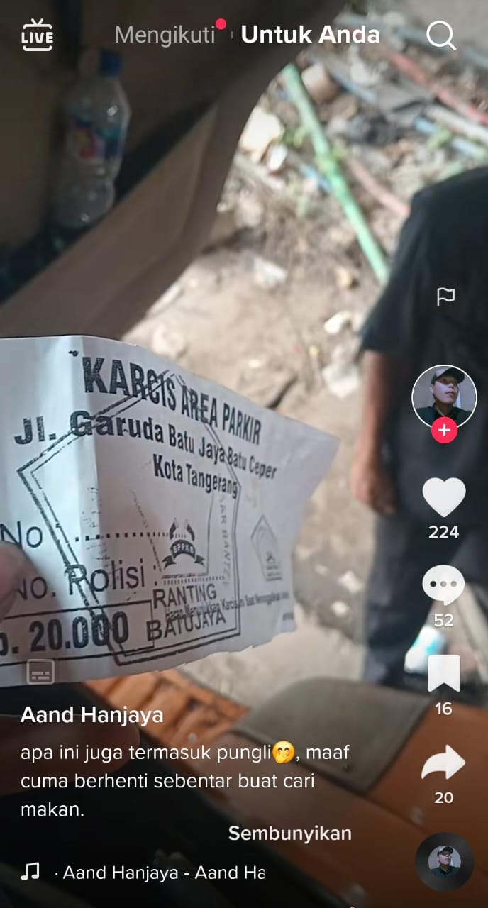 Tangerang – Bantenmore.com ¦ Polsek Batuceper Polres Metro Tangerang Kota bertindak cepat menanggapi sebuah video viral di TikTok yang diunggah oleh Aand Hanjaya. Dalam video tersebut, Aand mengeluhkan tarif parkir liar sebesar Rp. 20.000,- untuk parkir sebentar di Jalan Garuda, Kelurahan Batujaya, Kecamatan Batuceper, Kota Tangerang. Ia juga menunjukkan selembar karcis dengan logo organisasi masyarakat (ormas) BPPKB ranting Batujaya. Selasa (28/01/25)