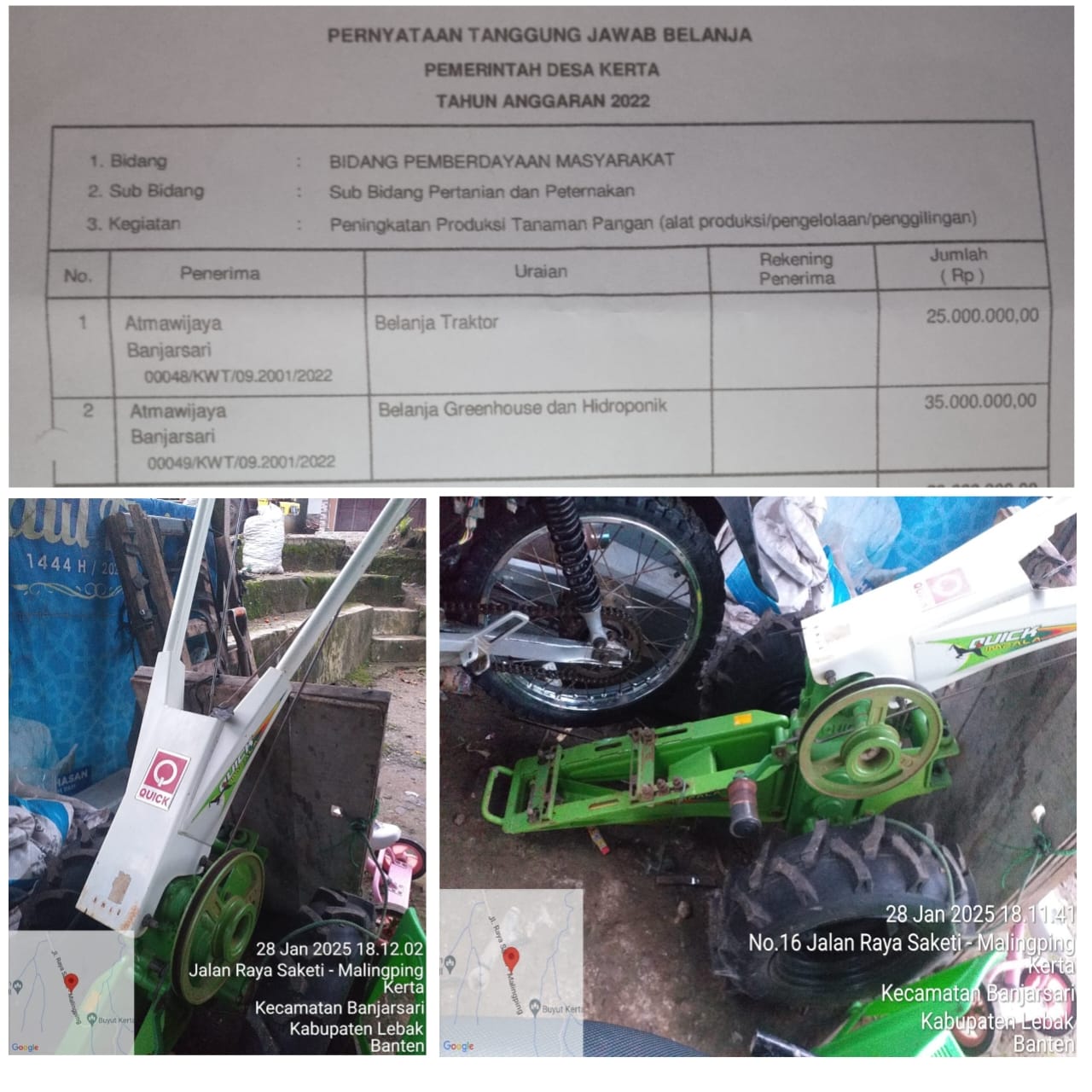 Lebak – Bantenmore.com ¦ Bukan hanya terkait penggunaan sabu dan kepemilikan senjata api yang di tudingkan warga masarakat desa kerta, belakangan ini terdengar isu adanya dugaan penjualan aset milik desa oleh RJ selaku Kades Kerta, yang bersumber dari dana desa (DD) tahun 2022 melalui Ketahanan Pangan, (Ketapang) Jenis traktor sub bidang Pertanian dengan anggaran 25.000.000. Selasa (28/1/25)