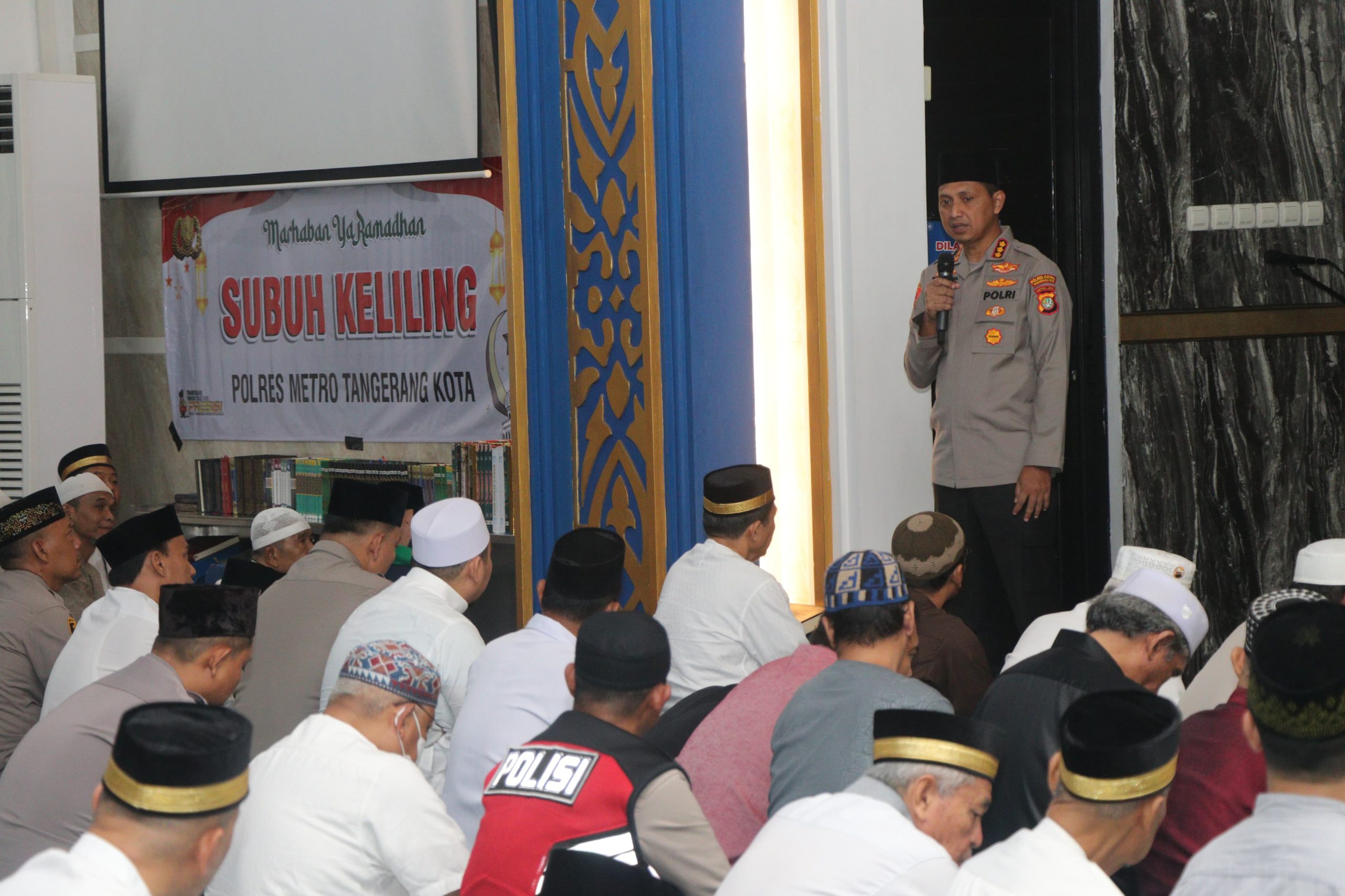 Tangerang Kota – Bantenmore.com ¦ Kapolres Metro Tangerang Kota, Kombes Pol Zain Dwi Nugroho melaksanakan safari Ramadhan 1446 Hijriah/2025 Masehi melalui kegiatan Subuh Keliling (Suling) di Masjid Rahmatan Lil’Alamin di Perumahan Modern Land Jalan Taman Golf Boulevard Raya, Kelurahan Buaran Indah, Kecamatan Tangerang. Senin, (10/3/2025).