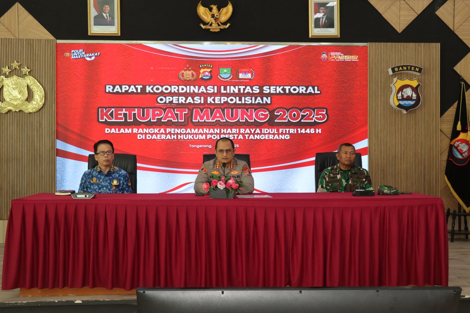 Tangerang – Bantenmore.com ¦ Rapat Koordinasi Eksternal Ops Ketupat Maung 2025 Hari Senin, 17 Maret 2025, jadi momen penting di Polresta Tangerang. Di Aula Parama Satwika, Kapolresta Tangerang, Kombes Pol. Baktiar Joko Mujiono, S.I.K., M.M., memimpin Rapat Koordinasi Eksternal untuk mempersiapkan Ops Ketupat Maung 2025. Rapat ini dihadiri oleh berbagai pihak, mulai dari PJU Polresta Tangerang, Kapolsek Jajaran, hingga perwakilan dari instansi lain seperti TNI, Dinas Perhubungan, dan Kesbangpol.
