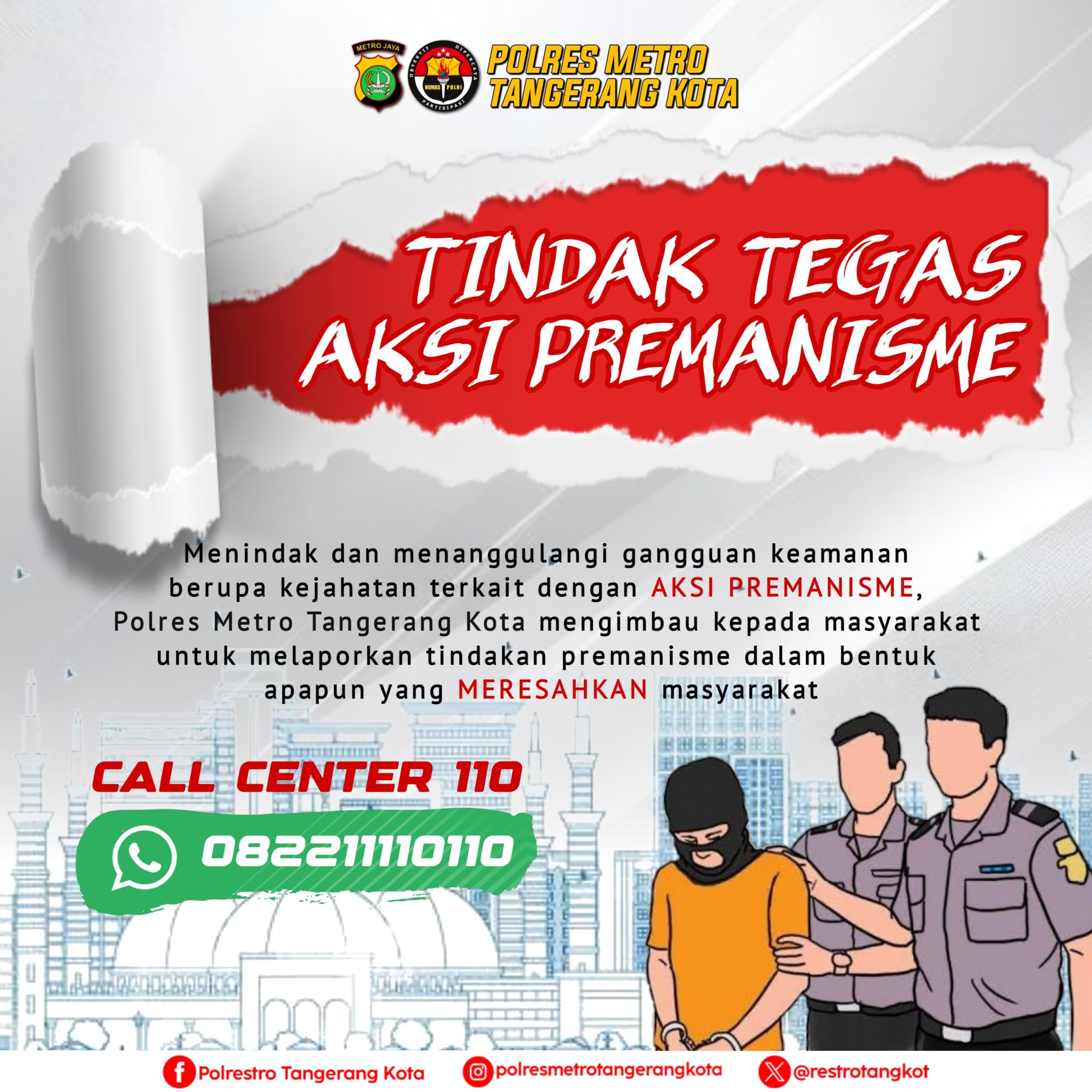Jika masyarakat menemukan, mengetahui dan atau mengalami aksi premanisme, segera laporkan melalui Call Center Polri 110 yang terhubung langsung ke Command Center Polres Metro Tangerang Kota atau dapat melalui pesan WhatsApp pengaduan di nomer 082211110110.