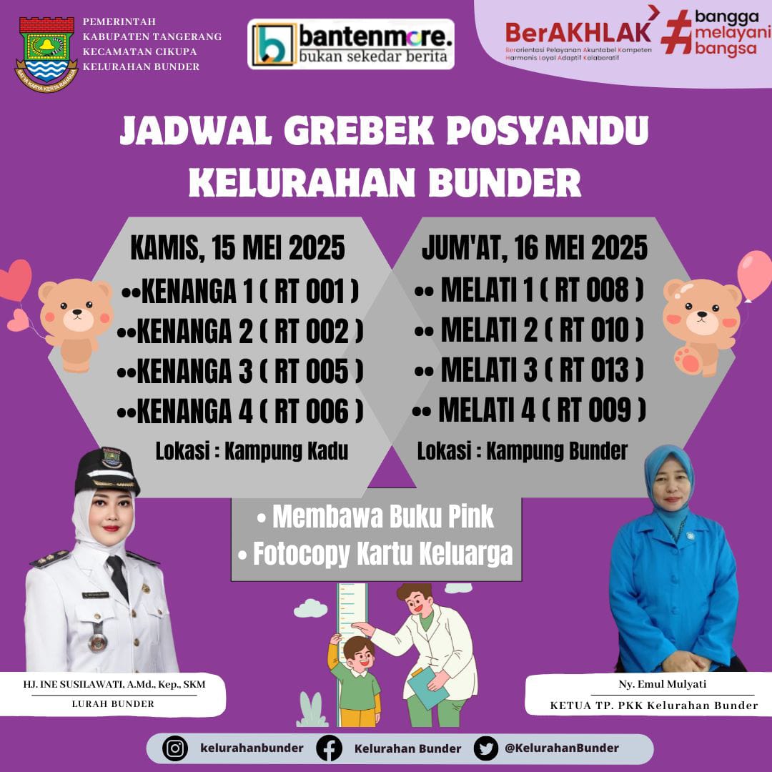 Tangerang – Bantenmore.com ¦ Pemerintah Kelurahan Bunder Kecamatan Cikupa, Kabupaten Tangerang, Banten, menggelar kegiatan Grebeg Posyandu serentak di 8 titik posyandu selama dua hari , sebagai akselerasi menekan angka stunting, Kamis (15/5/2025)