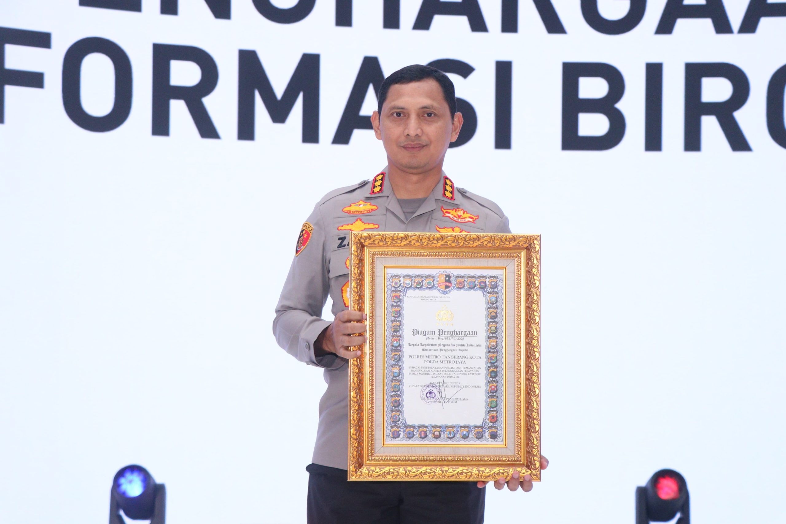 Penganugerahan ini menjadi bukti nyata dari komitmen dan kerja keras seluruh jajaran Polres Metro Tangerang Kota dalam menyelenggarakan pelayanan publik yang responsif, akuntabel, serta berorientasi pada kepuasan masyarakat. Penerimaan Penghargaan Kategori Pelayanan Prima ini merupakan yang kedua setelah tahun 2023 dari Menpan RB dan UPP Terbaik Penyediaan Sarpras Ramah Kelompok Rentan RB tahun 2024 dari Menpan RB.