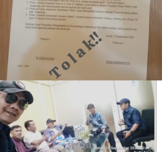 Pihak pertama difasilitasi bertemu dengan pimpinan Dinas PERKIM Kabupaten Tangerang untuk menyampaikan aspirasi awak pers.