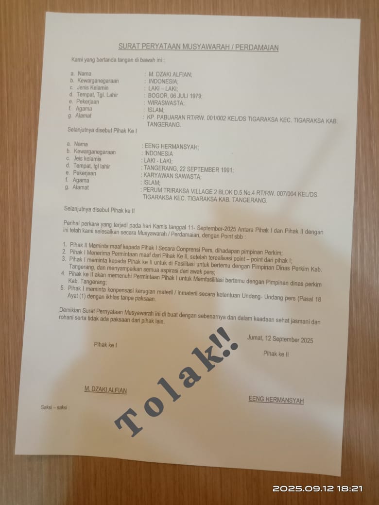 Tangerang – Bantenmore.com ¦ Telah beredar sebuah video yang memperlihatkan insiden di lingkungan Dinas Perumahan dan Permukiman (Perkim) Kabupaten Tangerang yang diduga melibatkan tindakan penghalangan terhadap kerja jurnalistik. Peristiwa tersebut berawal dari seorang pimpinan Gakorpan, M. Zaky, saat ingin konfirmasi kepada pejabat publik berwenang pada hari Kamis, 11 September 2025