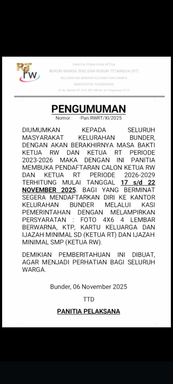 Ketua Panitia Yakub saat di konfirmasi Awak Media menyampaikan,”Kami, Panitia Pendaftaran Ketua RT dan RW se-Kelurahan Bunder, Kecamatan Cikupa, Kabupaten Tangerang, mengundang warga yang berminat dan memenuhi syarat untuk mendaftarkan diri sebagai calon Ketua RT dan RW periode 2026-2029. Pendaftaran dibuka mulai tanggal 17-22 November 2025. Kami berharap warga Kelurahan Bunder bagi yang berminat untuk mendaftarkan diri segera, dengan persyaratan Calon Ketua RT lulusan minimal SD, Calon Ketua RW lulusan SMP dan Calon yang memiliki integritas dan komitmen untuk melayani masyarakat dapat ikut serta dalam proses ini. Terima kasih.”Ucapnya