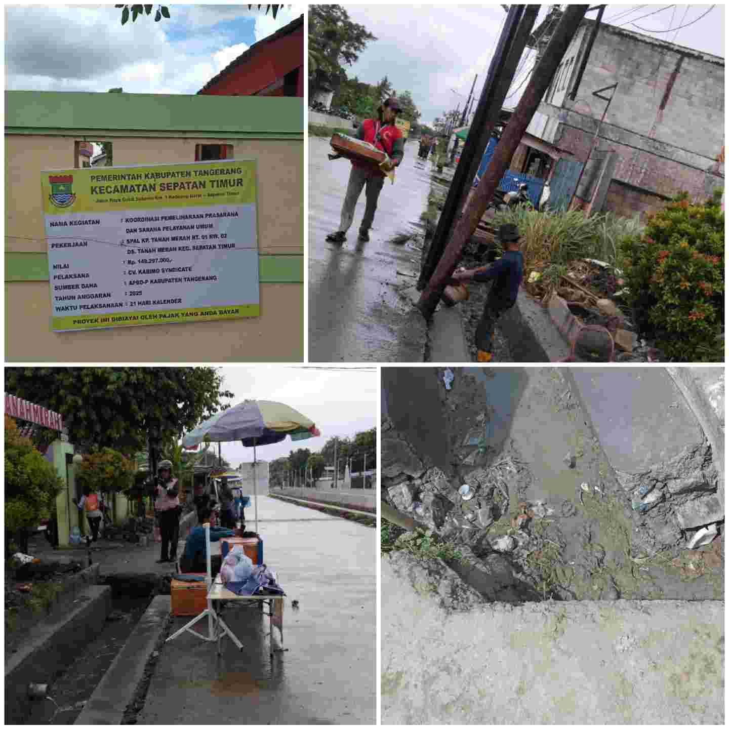 Berdasarkan informasi di lapangan, proyek tersebut berlokasi di RT 01/02 Desa Tanah Merah, Kecamatan Sepatan Timur, dengan nilai pagu anggaran sebesar Rp.149.297.000. Adapun pelaksana kegiatan tercatat atas nama CV. Kabimo Sindycate.