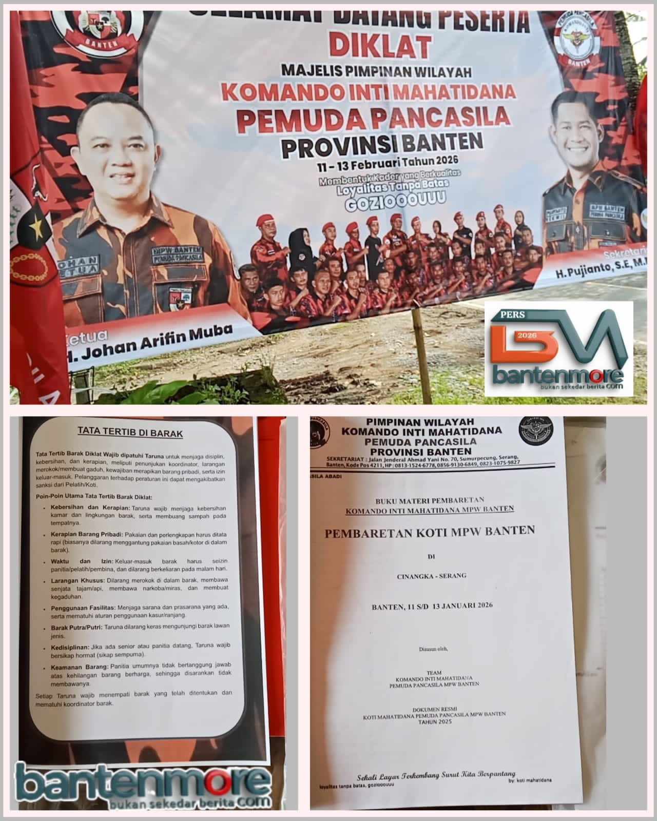 Serang Kota – Bantenmore.com ¦ Program Komando Inti (Koti) Mahatidana bertujuan membangun mental anggota yang jujur, setia, bermoral, dan beretika. Acara ini dimulai dengan pembaretan Koti Mahatidana MPW Provinsi Banten pada tanggal 11-13 Februari 2026 (selama 3 hari) di Bukit Indah, Pasauran, Kecamatan Cinangka, Kabupaten Serang, Provinsi Banten.Dengan tema, *”Membentuk Kader yang Berkualitas, Loyalitas Tanpa Batas,”GOZIOOOUUU”*