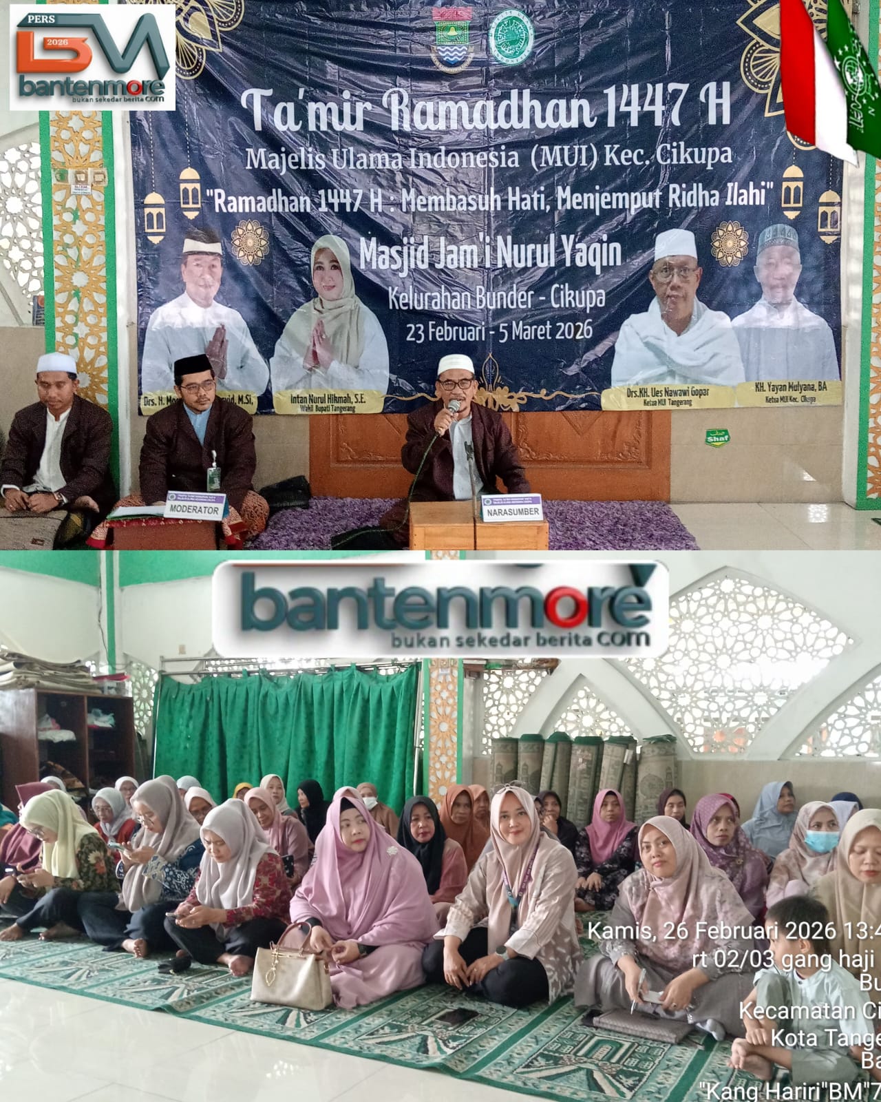 Cikupa – Bantenmore.com ¦ Pengurus Majelis Ulama Indonesia (MUI) Kecamatan Cikupa kembali menggelar, “Tak’mir Ramadhan 1447 H bertema, “MEMBASUH HATI, MENJEMPUT RIDHA ILAHI” di Masjid Jami Nurul Yaqin, Kp. Bunder RT 008 RW 02, Kelurahan Bunder, Kecamatan Cikupa, Kabupaten Tangerang, Provinsi Banten. Acara ini berlangsung khidmat dan lancar pada Kamis, 26 Februari 2026, pukul 13.00 WIB hingga pukul 15.30 WIB dilanjut Sholat fardhu Ashar berjama’ah.