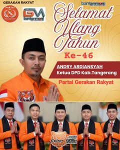 Tangerang – Bantenmore.com ¦ Hasan Hariri alias Kang Hariri’BM’79, Kepala Perwakilan Wilayah Provinsi (Kaperwilprov) Banten, juga selaku Ketua Cyber/Humas Media dan informasi digital PGR-DPD Kabupaten Tangerang, memaakili rekan-rekan nya, memberikan ucapan selamat ulang tahun kepada Andry Ardiansyah yang ke-46 tahun sebagai Ketua Partai Gerakan Rakyat Dewan Pimpinan Daerah (PGR-DPD) Kabupaten Tangerang Provinsi Banten, pada hari ini Selasa, 31 Maret 2026.