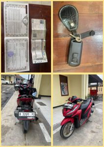 Dari tangan tersangka, polisi mengamankan barang bukti berupa satu unit handphone Vivo, satu buah kunci remot motor, serta sepeda motor milik korban. [*/Red BM]